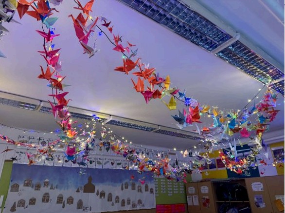 A japán hagyomány szerint az ezer papírdaru a remény, az összefogás és a béke jelképe. A munka során nemcsak a kezünk dolgozott, hanem a szívünk is: figyeltünk egymásra, segítettük azokat, akiknek nehezebben ment és örültünk minden elkészült darabnak. Sokat beszélgettünk arról, hogy a béke nem csak távoli országok ügye, hanem itt kezdődik közöttünk, az osztályban. Abban, ahogyan vitás helyzeteket megoldunk, ahogyan elfogadjuk egymás különbözőségét, és ahogyan képesek vagyunk bocsánatot kérni és megbocsátani. A december közepére elkészült ezer daru különösen most, az adventi időszakban kap mélyebb jelentést. Emlékeztetnek bennünket arra, hogy a béke ajándék, amelyet továbbadhatunk egymásnak.